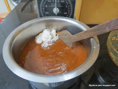 - Bring the flame to low and add roasted corn flour and stir to mix.